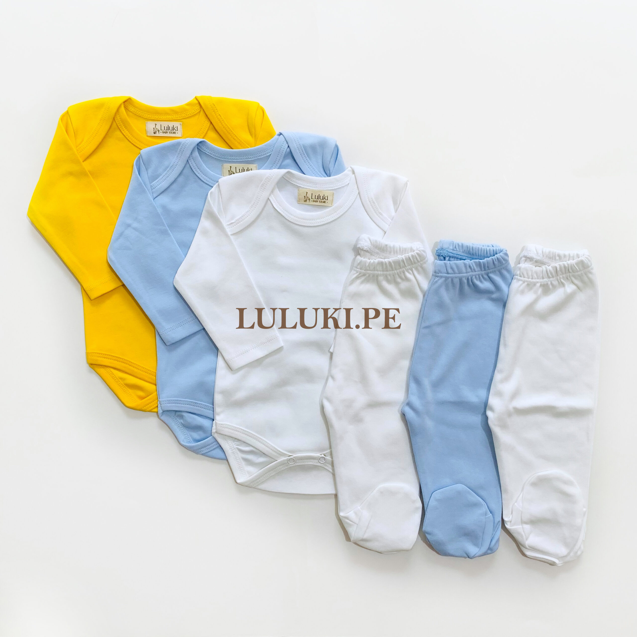 • 3 bodys manga larga con cuello americano color amarillo, blanco y celeste.